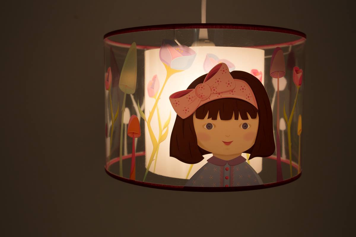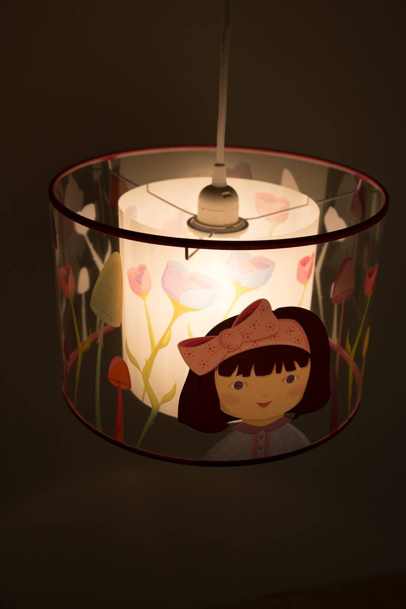 Ce modèle Alice est suspension imprimée de décors poétiques hauts en couleur pour illuminer les chambres d’enfants en transparence et lumière nacrée.