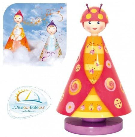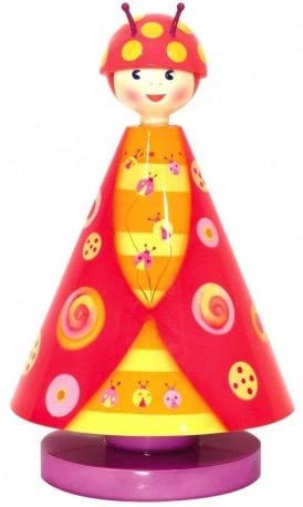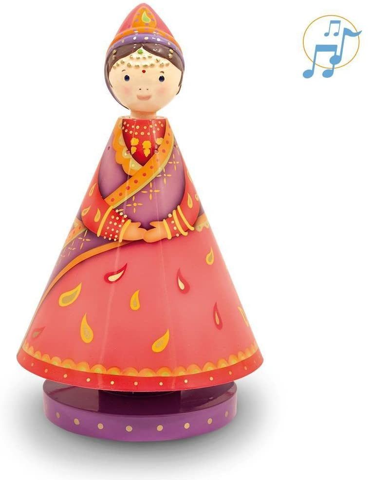 Boîte à musique à mécanisme manuel, intégré dans un personnage aux grandes vertus décoratives. Personnage en bois et résine, avec mécanisme rotatif pour la boîte à musique, durée environ 3 minutes. Matière : Bois et résine