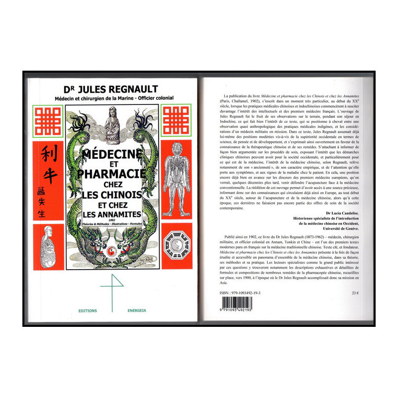 Publié ainsi en 1902, ce livre du Dr Jules Regnault (1873-1962) – médecin, chirurgien militaire, et officier colonial en Annam, Tonkin et Chine – est l’un des premiers textes modernes paru en français sur la médecine traditionnelle chinoise. Texte clé, et fondateur, Médecine et Pharmacie chez les Chinois et les Annamites présente à la fois de façon érudite et accessible un panorama d’ensemble de la médecine chinoise, dans sa théorie, ses méthodes et sa pratique. Les lecteurs spécialistes comme le grand public intéressés par ces questions y trouveront notamment les descriptions exhaustives et détaillées de formules et compositions de nombreux remèdes de la pharmacopée chinoise, recueillies sur place, vers 1900, à l’époque ou le Dr Jules Regnault accomplissait donc sa mission en Asie.